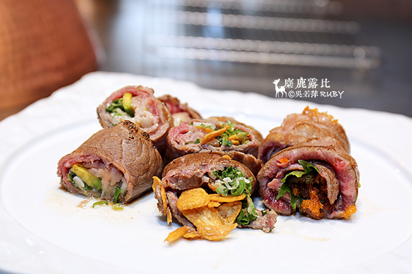 ▲朋友們的主菜美國安格斯沙朗牛肉捲三味,分別為含有比目魚、黑鮪的鮮香風味、紫蘇葉及魚卵結合的清香啵啵口感及洋蔥、青蔥等純粹清甜,結合出三種截然不同風味的牛肉卷。