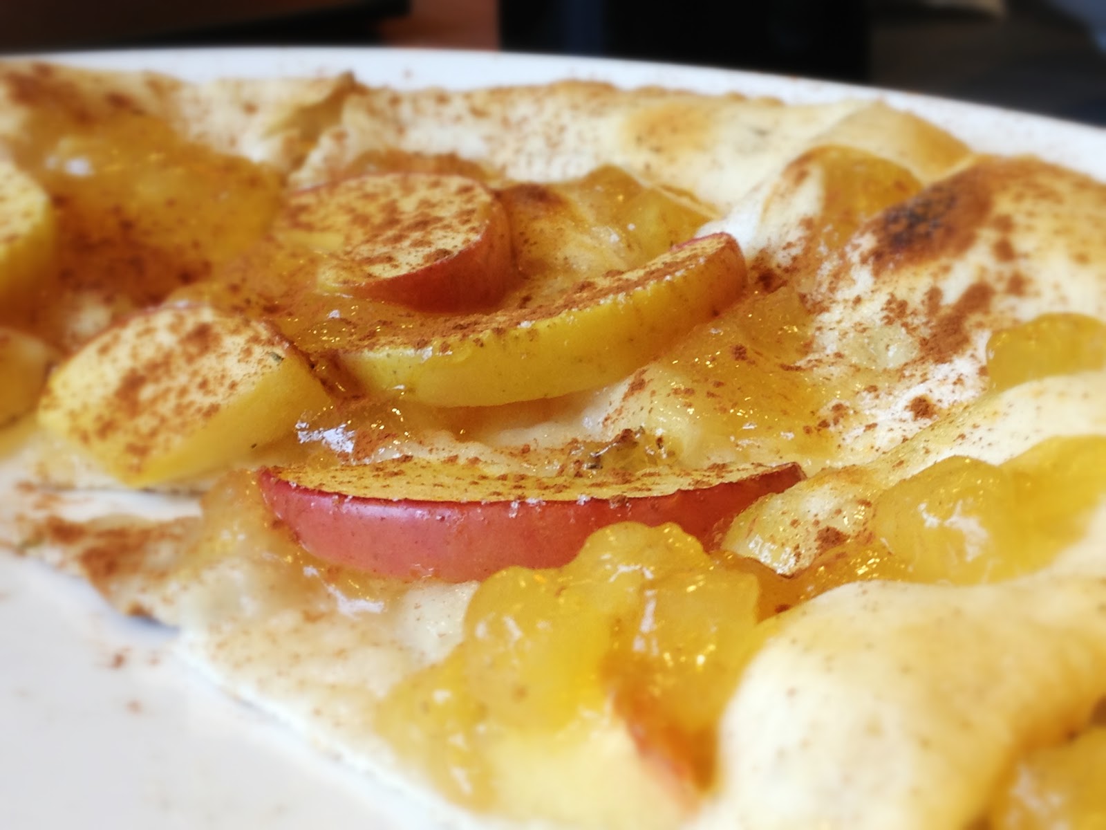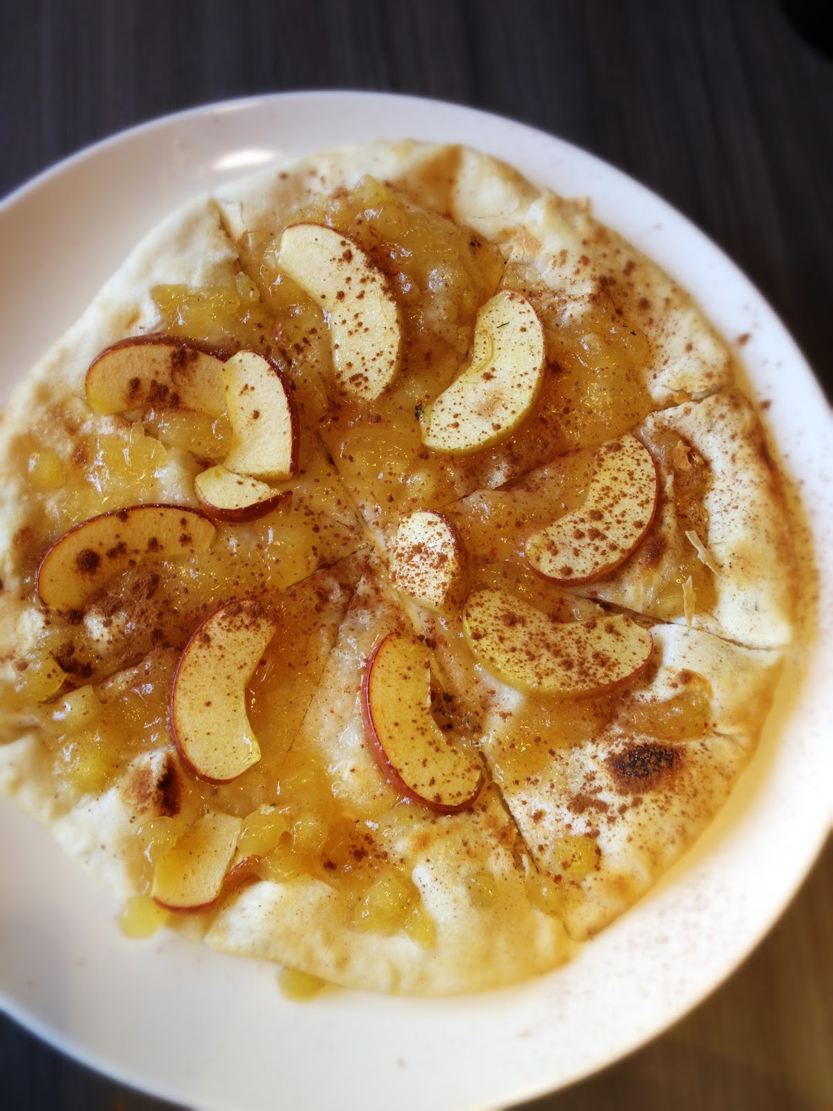 新鮮蘋果丁煮成的蘋果泥及蘋果片鋪陳在薄餅上窯烤後灑以肉桂粉.......Is my favorite…