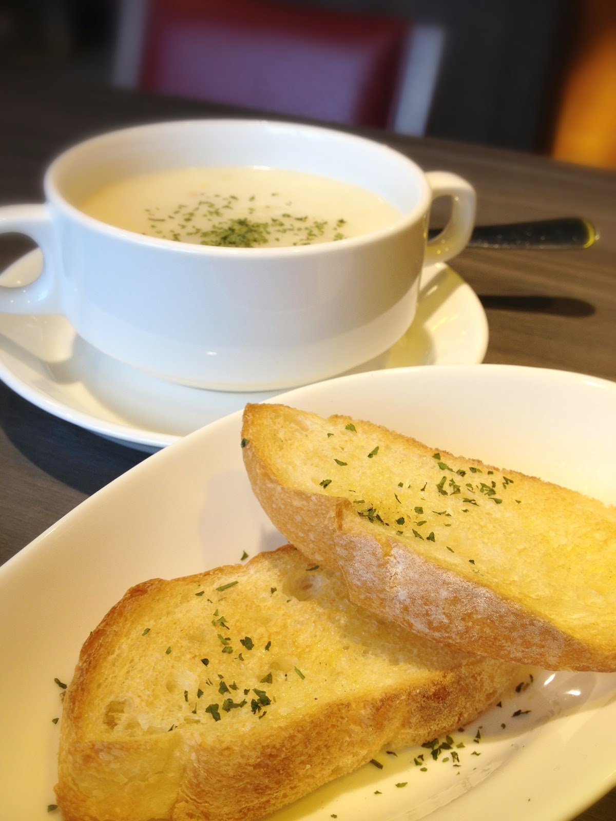 這道130元的今日湯品「巧達濃湯」雖然附了兩片沒有蒜味烤得不怎酥的香蒜麵包,但可以說是不夠水準的,CP值相當低,所以還是認真的喝杯咖啡比較實際吧!!