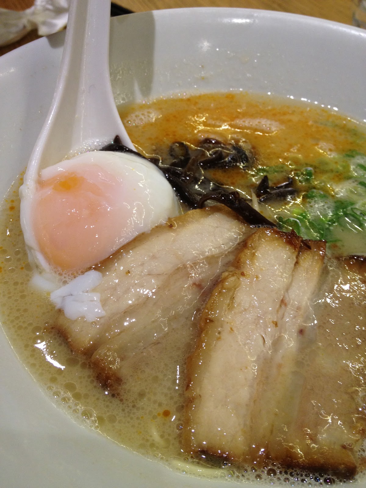 精心慢熬而成的豚骨湯頭盛上薄切叉燒跟博多特有的極細麵條,外加一顆白玉蛋,看似簡單卻層次豐富的湯頭讓人忍不住一口接一口!